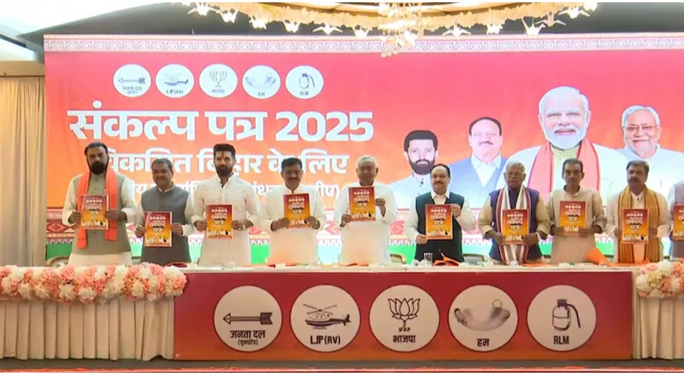 ബീഹാർ നിയമസഭാ തിരഞ്ഞെടുപ്പിലെ ഒന്നാം ഘട്ട വോട്ടെടുപ്പിന് ദിവസങ്ങൾ മാത്രം ശേഷിക്കെ, എൻഡിഎ പ്രകടനപത്രിക പുറത്തിറക്കി. വൻതോതിലുള്ള കുടിയേറ്റം നടക്കുന്ന സംസ്ഥാനത്ത് ഒരു കോടി സർക്കാർ ജോലികൾ ഉൾപ്പെടെ നിരവധി വലിയ വാഗ്ദാനങ്ങളാണ് പ്രകടനപത്രികയിലുള്ളത്. ബിജെപി അധ്യക്ഷൻ ജെപി നദ്ദയും മുഖ്യമന്ത്രി നിതീഷ് കുമാറും മറ്റ് മുതിർന്ന നേതാക്കളും ചേർന്നാണ് പട്നയിൽ പ്രകടനപത്രിക പ്രകാശനം ചെയ്തത്.