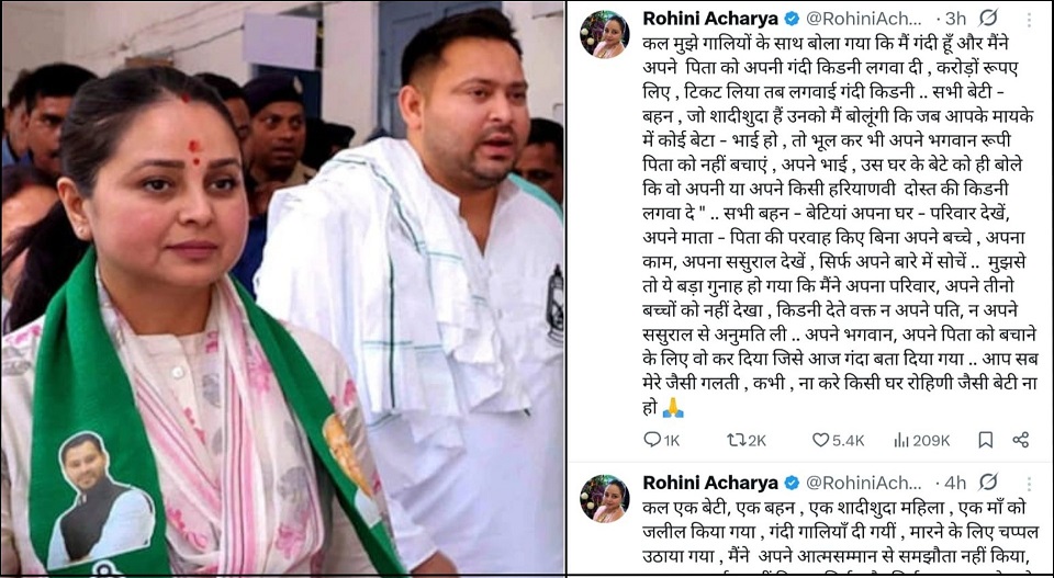 ‘മാതാപിതാക്കളെയും സഹോദരിമാരെയും ഉപേക്ഷിച്ച് തനിക്ക് വീട്ടിൽ നിന്ന് ഇറങ്ങേണ്ടി വന്നു. തൻ്റെ ദൈവമായ അച്ഛനെ രക്ഷിക്കാൻ വൃക്ക ദാനം ചെയ്ത തനിക്ക് സംഭവിച്ച തെറ്റ് മറ്റാർക്കും സംഭവിക്കരുത് എന്നും’ രോഹിണി വൈകാരികമായി കുറിച്ചു. മുൻപ്, സഹോദരൻ തേജ് പ്രതാപ് യാദവിനെ പാർട്ടിയിൽ നിന്ന് പുറത്താക്കിയതിലും രോഹിണിക്ക് അതൃപ്തിയുണ്ടായിരുന്നു. എന്നാൽ തിരഞ്ഞെടുപ്പ് സമയത്ത് അവർ തേജസ്വിക്ക് വേണ്ടി പ്രചാരണം നടത്തിയിരുന്നു.