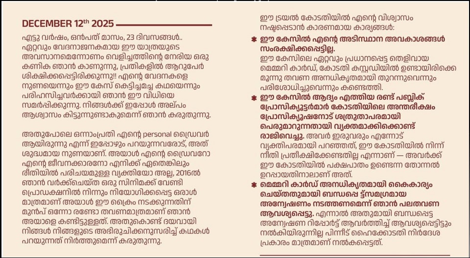 ഈ രാജ്യത്ത് നിയമത്തിന് മുന്നിൽ എല്ലാവരും ഒരുപോലെ അല്ലെന്ന് വേദനയോടെ തിരിച്ചറിയുന്നു. തൻ്റെ മൗലിക അവകാശങ്ങൾ സംരക്ഷിക്കപ്പെട്ടിട്ടില്ല. ഈ കോടതിയിൽ നിന്ന് നീതി പ്രതീക്ഷിക്കേണ്ടെന്ന് പ്രോസിക്യൂട്ടർമാർ പോലും തന്നോട് പറഞ്ഞിരുന്നു. അവർക്ക് കോടതിയിൽ പക്ഷപാതമുണ്ടെന്ന തോന്നലുണ്ടായിരുന്നു. കേസിൻ്റെ പ്രധാന തെളിവായ മെമ്മറി കാർഡ്, കോടതിയുടെ കസ്റ്റഡിയിൽ ഇരിക്കെ മൂന്ന് തവണ അനധികൃതമായി തുറന്നു പരിശോധിച്ചു എന്നും കുറിപ്പിൽ പറയുന്നു.