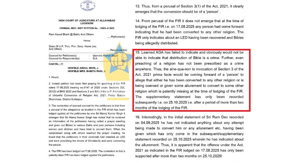 മതിയായ തെളിവുകളോ പരാതികളോ ഇല്ലാതെ ക്രൈസ്തവ വിശ്വാസിയായ റാം കേവല് ഭാരതി എന്ന വ്യക്തി ഉള്പ്പടെ നിരവധിപേര്ക്കെതിരെ മതപരിവര്ത്തന നിരോധന നിയമം ചുമത്തി മനോജ് കുമാര് സിംഗ് എന്ന പോലീസുദ്യോഗസ്ഥന് ഈ വര്ഷം ഓഗസ്റ്റ് 17 ന് കേസെടുത്തിരുന്നു. പിന്നാലെ ഇവരെ അറസ്റ്റ് ചെയ്തു ലോക്കപ്പിലാക്കി. ദലിതരും പാവപ്പെട്ടവരുമായ ഒരുസംഘം ആള്ക്കാര് സുല്ത്താന്പൂര് ജില്ലയിലെ ധമ്മൗവര് പോലീസ് സ്റ്റേഷന് പരിധിയില് സംഘടിപ്പിച്ച പ്രാര്ത്ഥന യോഗത്തില് പങ്കെടുത്തിരുന്നു. ഇവരെ മതംമാറ്റാനായി ബൈബിള് വിതരണം ചെയ്തു എന്നാരോപിച്ചാണ് പോലീസ് കേസ് എടുത്തത്. റാം കേവല് ഭാരതിക്കും കൂട്ടര്ക്കുമെതിരെ ചുമത്തിയ എഫ്ഐആര് റദ്ദാക്കണം എന്ന് ആവശ്യപ്പെട്ട് സമര്പ്പിച്ച ഹര്ജിയിലാണ് ഹൈക്കോടതി ഡിവിഷന് ബെഞ്ച് സുപ്രധാന നിരീക്ഷണങ്ങള് നടത്തിയത്. എന്നാല് പരാതിക്കാര്ക്ക് ജാമ്യം അനുവദിച്ചില്ല. സര്ക്കാരിന്റെ മറുപടി ലഭിച്ച ശേഷം ഹര്ജിയില് തീരുമാനം എടുക്കാം എന്ന് കോടതി നിലപാട് എടുത്തു.