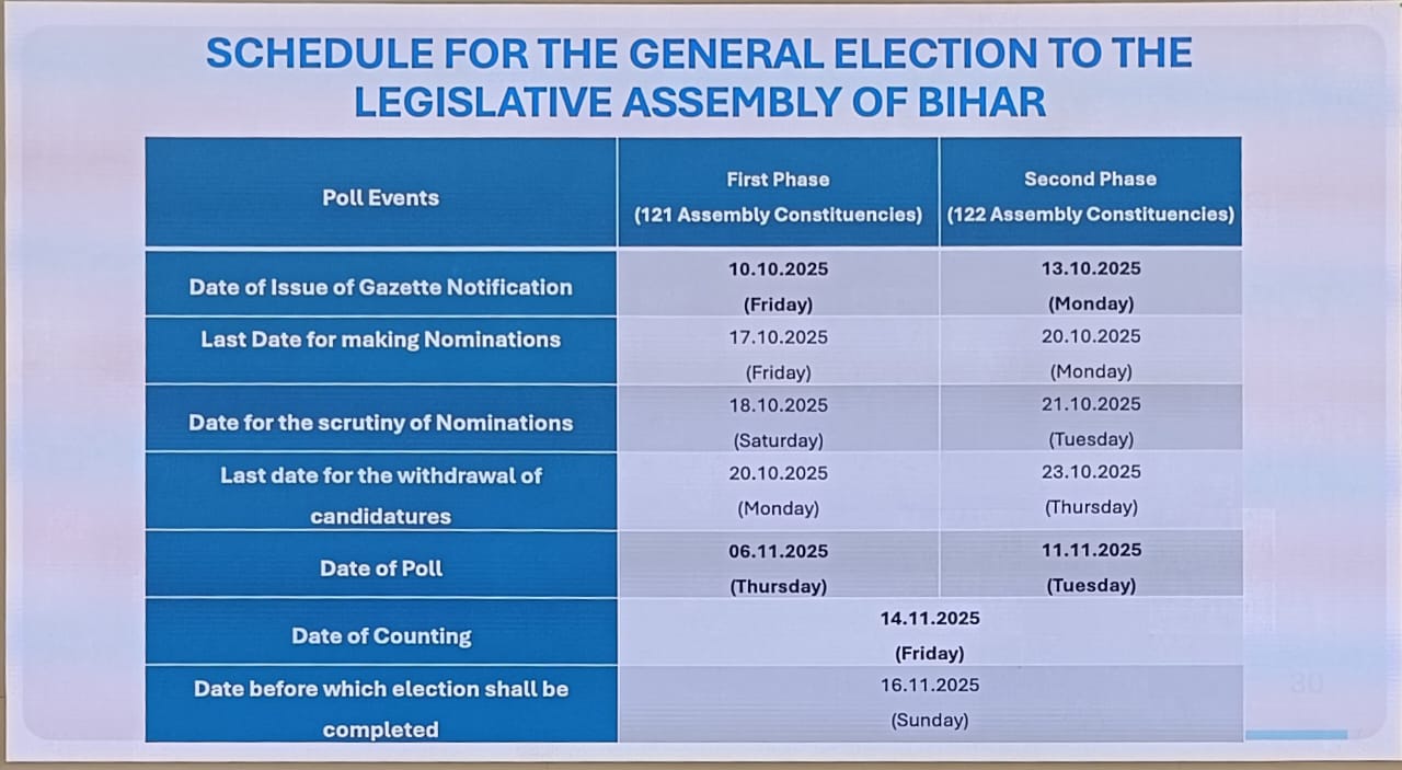 ബിഹാറില് നിയമസഭ തിരഞ്ഞെടുപ്പ് രണ്ടുഘട്ടമായി; വോട്ടെണ്ണല് 14ന്
