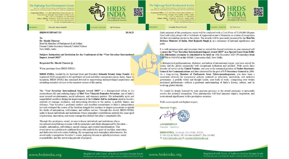ശശി തരൂരിന് വീര് സവര്ക്കര് അവാര്ഡ്; താമരത്തണിലേക്ക് അടുത്ത് വിശ്വപൗരൻ