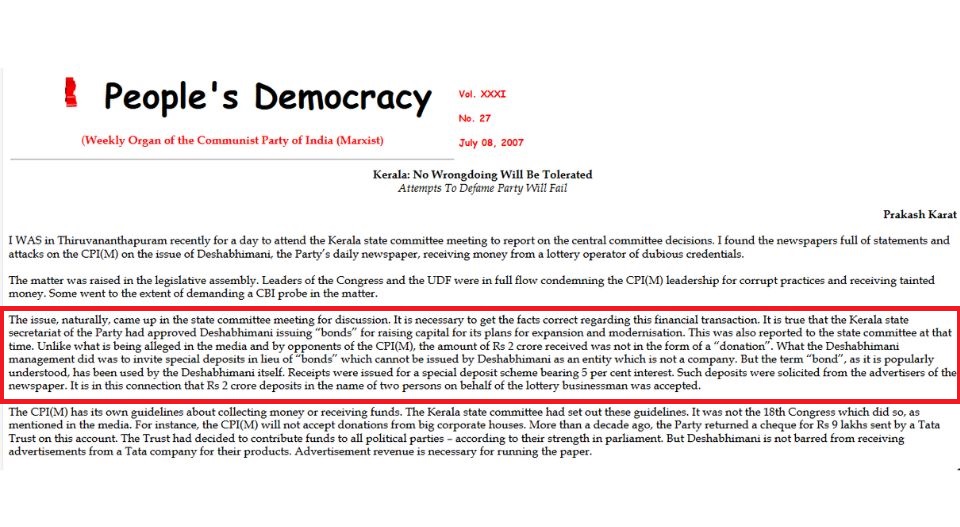 “സ്വീകരിച്ചത് സംഭാവനയല്ലെങ്കിലും സംശയകരമായ വ്യക്തിത്വമുള്ള ഒരാളില് നിന്ന് ദേശാഭിമാനി എന്തിന് പണം വാങ്ങിയെന്ന ചോദ്യം അവശേഷിക്കുകയാണ്. പാര്ട്ടി അണികളും വലിയൊരു വിഭാഗം പൊതുജനങ്ങളും ഈ ചോദ്യം തന്നെ ഉയര്ത്തിയതിനാലാണ് പണം തിരിച്ചു നല്കാന് പാര്ട്ടി സംസ്ഥാന കമ്മിറ്റി ശരിയായ തീരുമാനമെടുത്തത്”; ഇങ്ങനെയായിരുന്നു പീപ്പിള്സ് ഡെമോക്രസി ലേഖനത്തില് കാരാട്ട് എഴുതിയത്. പാര്ട്ടി പത്രത്തിന് നിരക്കുന്ന രീതിയില് അല്ലാതെ ക്രിമിനല് കേസില്പ്പെട്ടതും നിയമവിരുദ്ധ പ്രവര്ത്തികള് ചെയ്തു വരുന്നതുമായ ലോട്ടറി കച്ചവടക്കാരനില് നിന്ന് രണ്ട് കോടി വാങ്ങിയതിനാലാണ് പാര്ട്ടി അംഗങ്ങളും അഭ്യുദയ കാംക്ഷികളും ഇത് അംഗീകരിക്കാത്തത് എന്ന് വളരെ ഖണ്ഡിതമായി കാരാട്ട് എഴുതിയ കാര്യം ആത്മകഥയില് ഇപി മറച്ചുവച്ചിരിക്കുകയാണ്.