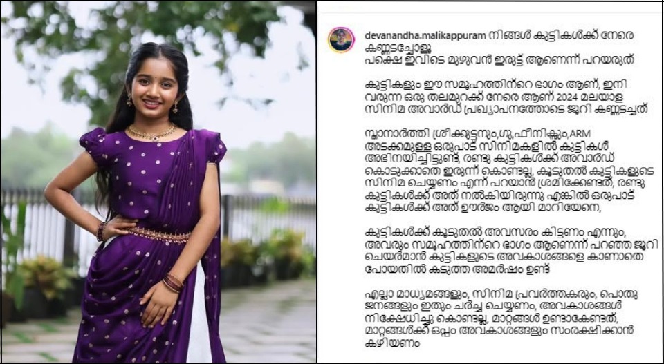 2024ലെ സംസ്ഥാന ചലച്ചിത്ര അവാർഡ് പ്രഖ്യാപനത്തിൽ ബാലതാരങ്ങൾക്ക് പുരസ്കാരം നൽകാതിരുന്നതിനെതിരെ രൂക്ഷ വിമർശനവുമായി മാളികപ്പുറം സിനിമയിലെ ബാലതാരം ദേവനന്ദ. പുരസ്കാര പ്രഖ്യാപനവുമായി ബന്ധപ്പെട്ട് ജൂറി ചെയർമാൻ പ്രകാശ് രാജ് നടത്തിയ ചില പ്രതികരണങ്ങൾ ചൂണ്ടിക്കാട്ടിയാണ് ദേവനന്ദ പ്രതിഷേധം സാമൂഹിക മാധ്യമങ്ങളിലൂടെ അറിയിച്ചത്.