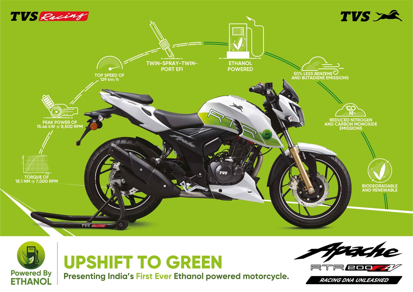 ഇതൊക്കെ വെറും തള്ളാല്ലേ? എന്ന് ചോദിക്കുന്നവർക്ക് മുന്നിലേക്കാണ് ഇന്ത്യയിലെ ആദ്യത്തെ 100% എഥനോൾ ബൈക്ക് എന്ന ഖ്യാതിയോടെ TVS തങ്ങളുടെ ഐക്കോണിക് മോഡലായ Apache RTR 200 Fi E100 അവതരിപ്പിച്ചത്. പേര് സൂചിപ്പിക്കുന്നത് പോലെ തന്നെ, ഇതിൽ പെട്രോൾ ഒട്ടും ചേർക്കാതെ ശുദ്ധമായ എഥനോളിൽ മാത്രം യാത്ര ചെയ്യാം. എഥനോൾ പമ്പുകളുടെ ലഭ്യത കുറവായതിനാൽ ചില സംസ്ഥാനങ്ങളിൽ മാത്രമാണ് ഈ മോഡൽ അവതരിപ്പിക്കപ്പെട്ടത്. എങ്കിലും, ഇലക്ട്രിക് വാഹനങ്ങൾ വാങ്ങാനാവശ്യമായ വലിയ മൂലധനമില്ലാതെ തന്നെ സാധാരണക്കാരന് ഇന്ധനച്ചെലവ് പകുതിയായി കുറയ്ക്കാമെന്ന് ടിവിഎസ് ഇതിലൂടെ തെളിയിച്ചു.