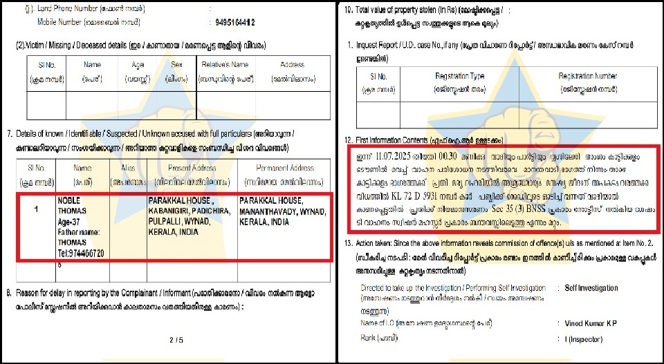 മനുഷ്യജീവന് അപകടകരമായ വിധത്തില് KL 72 D 5931 എന്ന വാഹനമോടിച്ച് വരുന്നതിനിടയിലാണ് രാത്രി 12.30ന് ഇയാള് പൊലീസിന്റ പിടിയിലായത്. തിരുനെല്ലി പൊലീസിന്റെ പിടിയിലാകുമ്പോള് ആൽക്കോമീറ്റര് (Alcometer) ഉപയോഗിച്ച് നടത്തിയ പരിശോധനയില് (Blood Alcohol Content – BAC) രക്തത്തില് 173mg/100 ml മദ്യം ഉണ്ടെന്ന് കണ്ടെത്തി. വാഹനം ഓടിക്കുന്ന ഒരാള്ക്ക് നിയമപരമായി അനുവദനീയമായ മദ്യത്തിന്റെ അളവിനേക്കാള് വളരെ കൂടുതലായിരുന്നു എന്നാണ് എഫ്ഐആറില് രേഖപ്പെടുത്തിയിരിക്കുന്നത്.