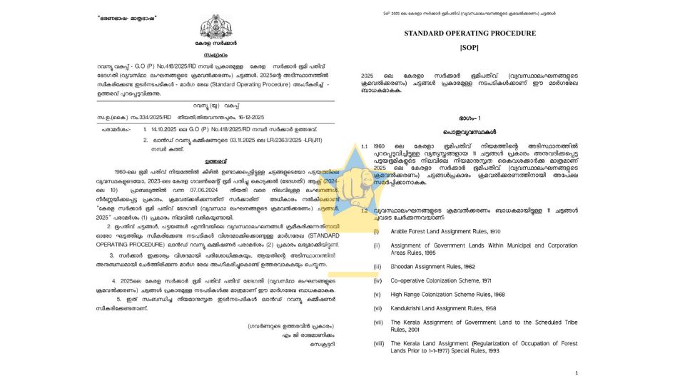 സര്ക്കാരിന്റെ ഭരണകാലാവധി തീരാന് മാസങ്ങള് മാത്രം അവശേഷിക്കെ ഇടുക്കിയിലെ പാവങ്ങളുടെ പേരു പറഞ്ഞ് കടുംവെട്ടിന് കളമൊരുക്കുന്നു. സംസ്ഥാനത്ത് ഏറെ വിവാദങ്ങള്ക്ക് വഴിവെച്ച ഭൂപതിവ് നിയമഭേദഗതിയുടെ മറവില് വന്കിട കയ്യേറ്റങ്ങളും ചട്ടലംഘനങ്ങളും ക്രമവല്ക്കരിക്കാന് സര്ക്കാര് ഉത്തരവിറക്കി. ഈ മാസം 16-ന് പുറത്തിറക്കിയ സ്റ്റാന്ഡേര്ഡ് ഓപ്പറേറ്റിംഗ് പ്രൊസീജിയര് (SOP) പ്രകാരം, സാധാരണക്കാരായ കര്ഷകര്ക്കും കുടിയേറ്റക്കാര്ക്കും പുറമെ രാഷ്ട്രീയ പാര്ട്ടി ഓഫീസുകള്, വന്കിട റിസോര്ട്ടുകള്, വാണിജ്യ സമുച്ചയങ്ങള് എന്നിവയ്ക്കും ഈ ആനുകൂല്യം ഉറപ്പിക്കുന്ന വിധത്തിലാണ് ഉത്തരവിറക്കിയിരിക്കുന്നത്.