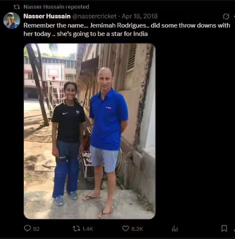 2018-ൽ ഇന്ത്യയിലെത്തിയ മുൻ ഇംഗ്ലണ്ട് ക്യാപ്റ്റനും വിഖ്യാത കമന്റേറ്ററുമായ നാസർ ഹുസൈൻ, മുംബൈയിലെ ഒരു അക്കാദമിയിൽ വെച്ച് 18 വയസ്സുള്ള ഒരു പെൺകുട്ടിയുടെ ബാറ്റിംഗ് കണ്ടു. അവളുടെ ടെക്നിക്കിൽ ആകൃഷ്ടനായ നാസർ, നെറ്റ്സിൽ അൽപ്പം പന്തെറിഞ്ഞു കൊടുത്തു. അന്ന് വൈകുന്നേരം അദ്ദേഹം ട്വിറ്ററിൽ കുറിച്ചത് ഇതായിരുന്നു: “ജമിമ റോഡ്രിഗ്സ്.. ഈ പേര് നിങ്ങൾ ഓർത്തുവച്ചോളു. ഇന്ത്യൻ ക്രിക്കറ്റിലെ അടുത്ത സുപ്പർ സ്റ്റാറാകാൻ ഈ കുട്ടിക്കു സാധിക്കും.”