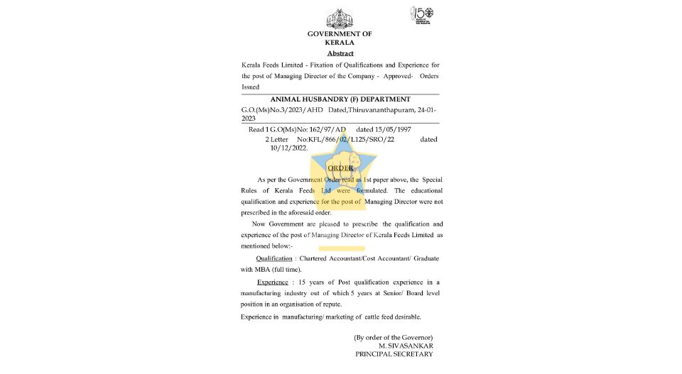 ശ്രീകുമാറിനെ ക്വാളിഫിക്കേഷന് അനുസരിച്ച് തന്നെയാണ് കേരള ഫീഡ്സ് എംഡിയുടെ യോഗ്യത നിര്ണയിച്ചത്. അത് അതിന് അനുസരിച്ചാണ് 1997 ലെ സര്ക്കാര് ഉത്തരവില് മാറ്റം വരുത്തിയത്. 2023 ജനുവരി 24നാണ് പുതിയ ഉത്തരവിറക്കിയത്. വിദ്യാഭ്യാസ യോഗ്യത, പ്രവര്ത്തി പരിചയം അടക്കം എല്ലാത്തിലും മാറ്റം വരുത്തുകയാണ് ചെയ്തത്. ആ ഓര്ഡര് ഇറക്കിയതാകട്ടെ പിന്നീട് നയതന്ത്രചാനല് സ്വര്ണ്ണക്കടത്ത് കേസില് പ്രതിയായ ഐഎഎസ് ഓഫീസര് എം ശിവശങ്കറും.