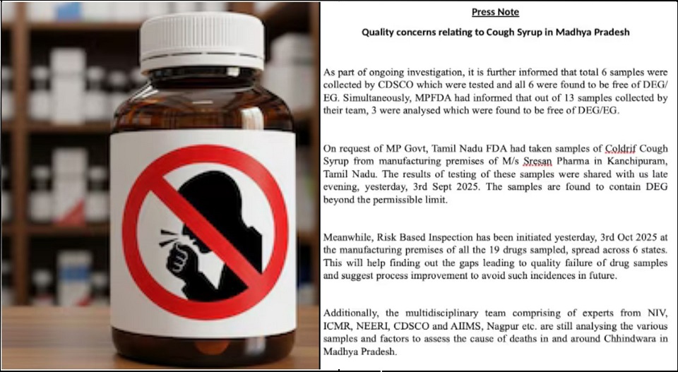 മധ്യപ്രദേശ് സർക്കാരിന്റെ അഭ്യർത്ഥന പ്രകാരമാണ് തമിഴ്നാട് ഫുഡ് ആൻഡ് ട്രക്ക് അഡ്മിനിസ്ട്രേഷൻ (FDA) സാമ്പിളുകൾ ശേഖരിച്ചത്. ഈ മേഖലയിൽ നിന്നും 19 മരുന്നുകളുടെ സാമ്പിളുകളും പരിശോധിച്ചിരുന്നു. കോൾഡ്രിഫ് കഫ് സിറപ്പിലാണ് പരിധിയിൽ കൂടുതൽ ഡിഇജി കണ്ടെത്തിയത്. എന്നാൽ മധ്യപ്രദേശിൽ ശേഖരിച്ച ആറു സാമ്പിളുകളിൽ ഈ പ്രശ്നം കണ്ടെത്തിയിരുന്നില്ല. കേന്ദ്ര സംഘങ്ങളുടെ പരിശോധന നിലവിൽ തുടരുകയാണ്.