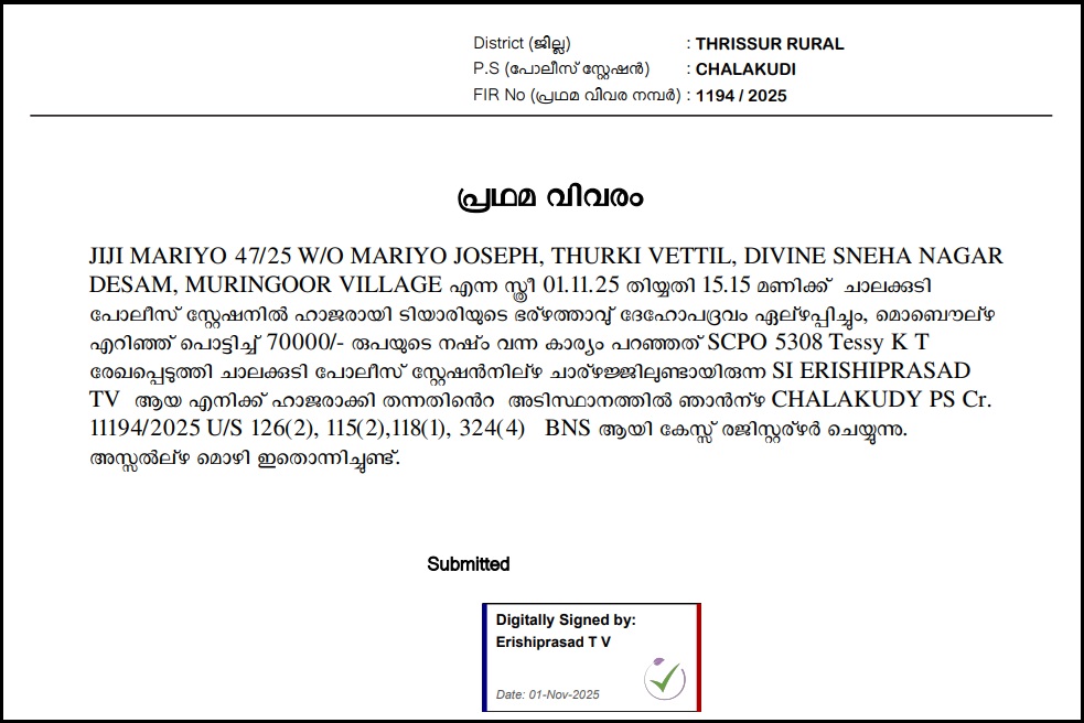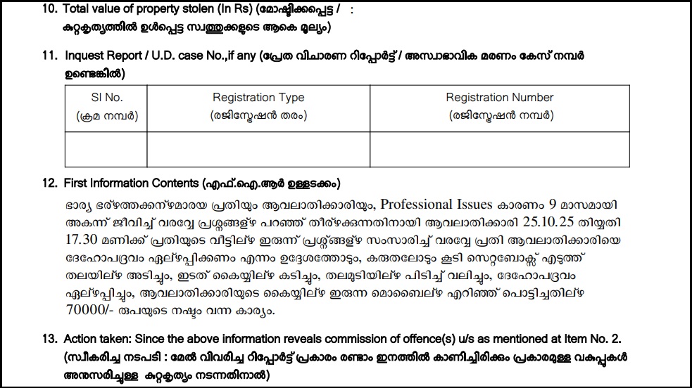 ഭാര്യാ ഭർത്താക്കന്മാരായ പ്രതിയും ആവലാതിക്കാരിയും Professional Issues കാരണം 9 മാസമായി അകന്ന് ജീവിച്ച് വരവേ, പ്രശ്നങ്ങൾ പറഞ്ഞ് തീർക്കുന്നതിനായി ആവലാതിക്കാരി 25.10.25 തിയ്യതി 17.30 മണിക്ക് പ്രതിയുടെ വീട്ടിൽ ഇരുന്ന് പ്രശ്നങ്ങൾ സംസാരിച്ച് വരവേ പ്രതി ആവലാതിക്കാരിയെ ദേഹോപദ്രവം എൽപ്പിക്കണം എന്ന ഉദ്ദേശത്തോടും കരുതലോടും കൂടി സെറ്റ്ബോക്സ് എടുത്ത് തലയിൽ അടിച്ചും, ഇടത് കയ്യിൽ കടിച്ചും, തലമുടിയിൽ പിടിച്ച് വലിച്ചും, ദേഹോപദ്രവം ഏല്പിച്ചു, ആവലാതിക്കാരിയുടെ കയ്യിൽ ഇരുന്ന മൊബൈൽ എറിഞ്ഞ് പൊട്ടിച്ചതിലും 70000/- രൂപയുടെ നഷ്ടം വന്ന കാര്യം.