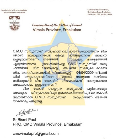 സന്യാസ വസ്ത്രം ധരിക്കാൻ നിലവിൽ അനുവാദമില്ലാത്ത വ്യക്തിയാണ് ടീന ജോസെന്നും, അവർ ചെയ്യുന്ന കാര്യങ്ങൾ പൂർണ്ണമായും സ്വന്തം ഉത്തരവാദിത്തത്തിലാണെന്നും സിഎംസി സമൂഹം പത്രക്കുറിപ്പിലൂടെ അറിയിച്ചു. ടീന ജോസ് നടത്തുന്ന പ്രസ്താവനകൾക്ക് സി.എം.സി. സമൂഹവുമായി യാതൊരു ബന്ധവുമില്ലെന്നും അവർ കൂട്ടിച്ചേർത്തു.