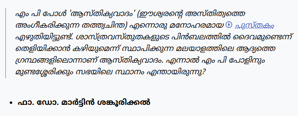 ‘നിരന്തരം ചോദ്യങ്ങളുമായി ജീവിച്ച പ്രൊഫ എംപി പോളിനെ ജീവിതാവസാനം തെമ്മാടിക്കുഴിയില് ആണ് അടക്കിയത് എന്നുള്ളത് ഭീതിദമായ ഒരു ഓര്മ്മയാണ്’ എന്നാണ് ഫാദര് മാര്ട്ടിന് എഴുതിയിരിക്കുന്നത്. ആദ്യമായാണ് എംപി പോളിനെ തെമ്മാടിക്കുഴിയില് അടക്കിയതിനെതിരെ ഒരു വൈദികന് പരസ്യമായി രംഗത്ത് വരുന്നത്. പോളിനോട് സ്വീകരിച്ച ഏതാണ്ട് അതേ സമീപനമായിരുന്നു മുന് വിദ്യാഭ്യാസ മന്ത്രിയും എഴുത്തുകാരനുമായ പ്രൊഫ ജോസഫ് മുണ്ടശ്ശേരിയോടും സഭാനേതൃത്വം സ്വീകരിച്ചതെന്ന് മാര്ട്ടിന് കുറ്റപ്പെടുത്തുന്നുണ്ട്. മരണശേഷം ഇവരുടെ ലെഗസിയെ സ്ഥാപനപരമായ മുതലെടുപ്പിന് ഉപയോഗിക്കാന് പലര്ക്കും മടിയില്ല എന്നത് ചരിത്രത്തിലെ വലിയ ഐറണി ആയി മാറുന്നു എന്നും ലേഖനത്തില് കുറ്റപ്പെടുത്തുന്നുണ്ട്.