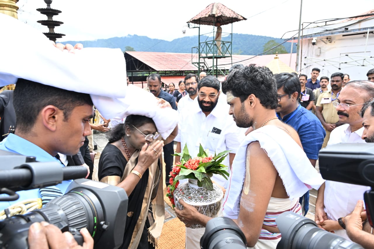 തുടര്ന്ന് ഇരുമുടിക്കെട്ട് ശ്രീകോവിലിന് മുന്നില് സമര്പ്പിച്ചു. മേല്ശാന്തി രാഷ്ട്രപതിക്ക് തീര്ത്ഥവും പ്രസാദവും നല്കി. ഏറെ നേരം ശ്രീകോവിലിന് മുന്നില് നിന്ന് രാഷ്ട്രപതി പ്രാര്ത്ഥിച്ചു. കാണിക്കയും അര്പ്പിച്ചു. ഉഷപൂജയടക്കം രാഷ്ട്രപതി തൊഴുതു. തുടര്ന്ന് മാളികപ്പുറം ക്ഷേത്രത്തിലും രാഷ്ട്രപതി ദര്ശനം നടത്തി. ദര്ശനം പൂര്ത്തിയാക്കിയ ശേഷം സന്നിധാനത്തെ പ്രധാന ഓഫീസ് കോംപ്ലക്സില് പ്രത്യേകം സജ്ജമാക്കിയ മുറിയില് രണ്ടുമണിക്കൂര് രാഷ്ട്രപതി തങ്ങും. രാഷ്ട്രപതിക്കുള്ള ഉച്ചഭക്ഷണം ഈ കെട്ടിടത്തിലെ അടുക്കളയിലാകും തയാറെടുക്കുക. ഇതിനായി രാഷ്ട്രപതിഭവന് ജീവനക്കാര് എത്തിയിട്ടുണ്ട്. ഈ കെട്ടിടം രണ്ടുദിവസമായി സുരക്ഷാ ഏജന്സികളുടെ നിയന്ത്രണത്തിലാണ്.