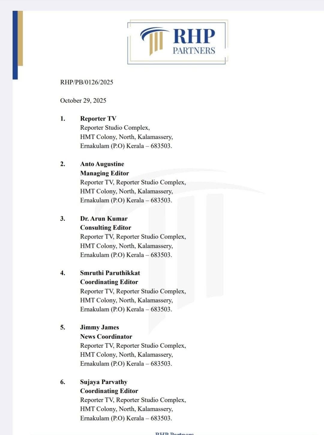 റിപ്പോര്ട്ടര് ഉടമ ആന്റോ അഗസ്റ്റിനെ കൂടാതെ മാധ്യമപ്രവര്ത്തകര്ക്ക് എതിരേയും കേസ് നല്കിയിട്ടുണ്ട്. കണ്സല്ട്ടിഗ് എഡിറ്റര് അരുണ് കുമാര്, കോര്ഡിനേറ്റിംഗ് എഡിറ്റര് സ്മൃതി പരുത്തിക്കാട്, കോര്ഡിനേറ്റിംഗ് എഡിറ്റര് സുജയ്യ പാർവതി, ന്യൂസ് കോര്ഡിനേറ്റര് ജിമ്മി ജയിംസ്, തിരുവനന്തപുരം ബ്യൂറോ ചീഫ് ടി.വി. പ്രസാദ് എന്നിവരടക്കം 9 പേര്ക്കെതിരെയാണ് കേസ്. തനിക്ക് യാതൊരു ബന്ധവുമില്ലാത്ത ബിപിഎല് എന്ന സ്ഥാപനത്തിന്റെ ഭൂമിയിടപാടുമായി ബന്ധപ്പെടുത്തി വ്യാജവാര്ത്തകള് തുടര്ച്ചയായി സംപ്രേക്ഷണം ചെയ്ത് മാനഹാനി ഉണ്ടാക്കി എന്നാണ് നോട്ടീസില് പറഞ്ഞിരിക്കുന്നത്. ഏഴ് ദിവസത്തിനുള്ളില് വ്യാജവാര്ത്ത പിന്വലിച്ച് മാപ്പ് പറയണമെന്നും ആവശ്യപ്പെട്ടിട്ടുണ്ട്.