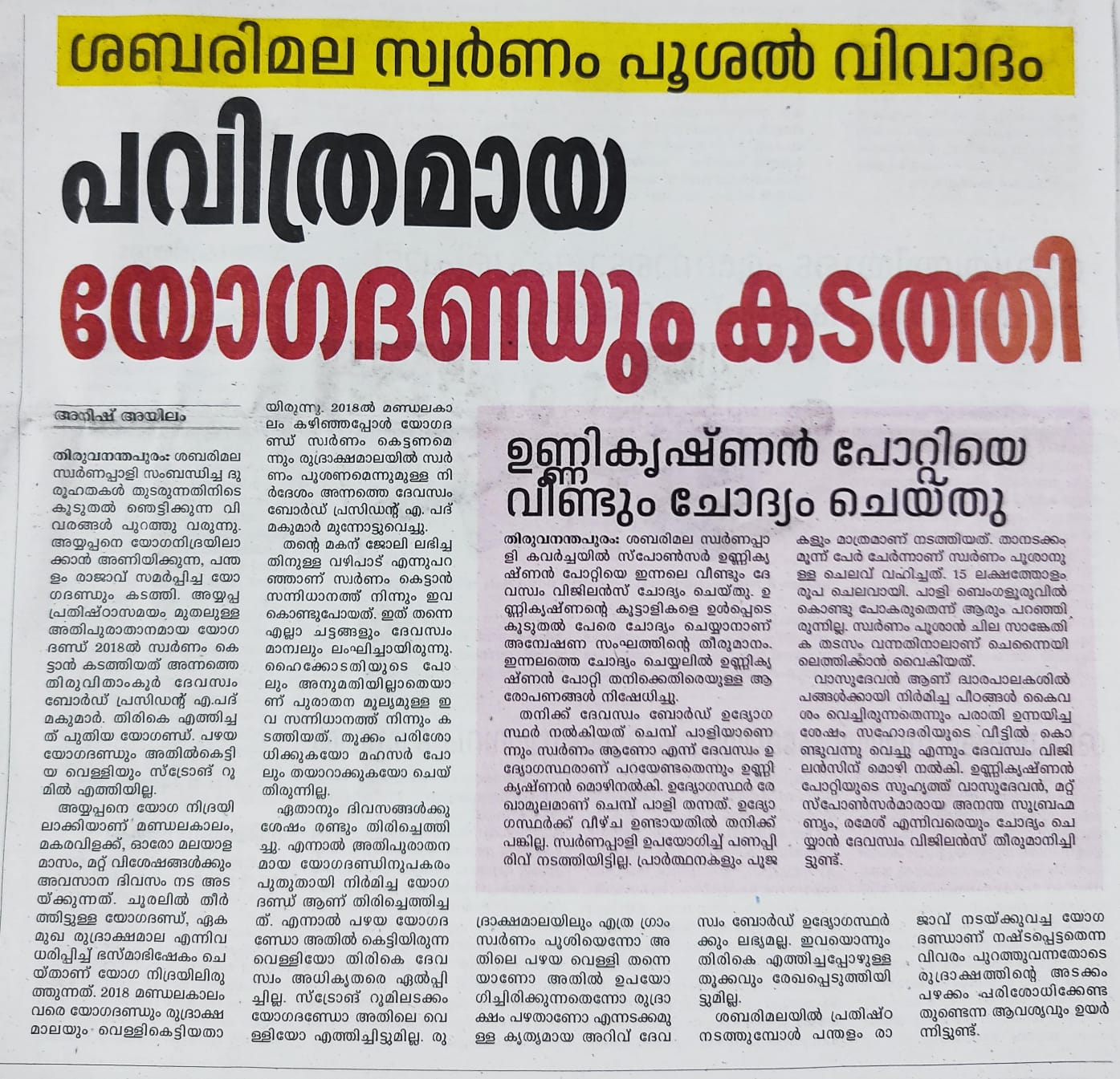 ശബരിമലയിലെ ദ്വാരപാലക ശില്പത്തിലെ സ്വര്ണപാളികള് കടത്തിക്കൊണ്ടുപോയ വിവാദം സര്ക്കാരിനേയും ദേവസ്വം ബോര്ഡിനേയും നിലയില്ലാക്കയത്തില് എത്തിച്ചിരിക്കെയാണ് പഴയ യോഗദണ്ഡ് കാണാതായ വിവരം ജന്മഭൂമി പുറത്തു കൊണ്ടുവന്നത്. അയ്യപ്പനെ യോഗ നിദ്രയിലാക്കിയാണ് മണ്ഡല മകരവിളക്ക് സീസണ്, മാസപൂജ, മറ്റ് വിശേഷങ്ങള് എന്നിവയുടെ അവസാന ദിവസം നട അടയ്ക്കുന്നത്. ചൂരലില് തീര്ത്ത യോഗദണ്ഡ്, ഏക മുഖ രുദ്രാക്ഷമാല എന്നിവ ധരിപ്പിച്ച് ഭസ്മാഭിഷേകം ചെയ്താണ് യോഗ നിദ്രയിലിരുത്തുന്നത്. 2018 ലാണ് ഈ യോഗദണ്ഡ് സ്വര്ണം പൂശണമെന്ന പദ്ധതിക്ക് രൂപം കൊടുത്തത്.