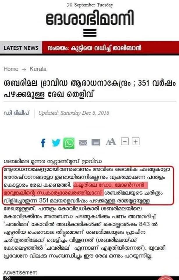 മൂന്നരനൂറ്റാണ്ട് മുമ്പ് ശബരിമല ദ്രാവിഡ ആരാധനാകേന്ദ്രമായിരുന്നു എന്നും അവിടെ വൈദിക ചടങ്ങുകളോ അനുഷ്ഠാനങ്ങളോ ഉണ്ടായിരുന്നില്ലെന്നും വ്യക്തമാക്കുന്ന പന്തളം കൊട്ടാരം രേഖ കണ്ടെത്തി. കലൂരിലെ ഡോ. മോന്സണ് മാവുങ്കലിന്റെ സ്വകാര്യശേഖരത്തിലാണ് ഈ രേഖയുള്ളത് എന്നായിരുന്നു ദേശാഭിമാനി വാര്ത്ത.