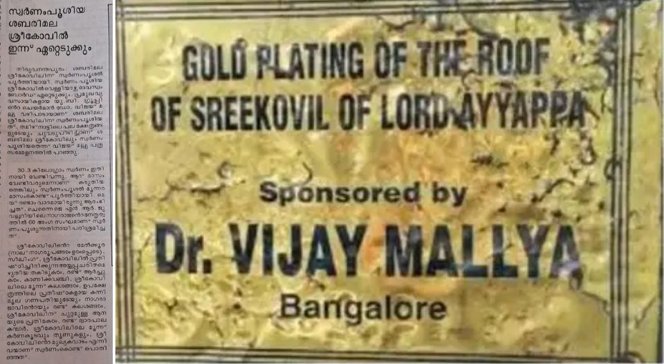 ശബരിമല ശ്രീധര്മ്മ ശാസ്താ ക്ഷേത്രത്തിലെ ശ്രീകോവിലിന്റെ മേല്ക്കൂര മുഴുവന് സ്വര്ണം പാകിയതു താനാണെന്ന് ഈ വര്ഷം ജൂണില് നടത്തിയ പോഡ്കാസ്റ്റ് അഭിമുഖത്തില് വ്യക്തമാക്കി വിജയ് മല്യ. ദൈവ വിശ്വാസിയാണോ എന്ന ചോദ്യത്തിനുത്തരമായിട്ടാണ് ഇക്കാര്യം വെളിപ്പെടുത്തിയത്. “തെക്കേ ഇന്ത്യയിലെ ഒട്ടുമിക്ക ക്ഷേത്രങ്ങളും സന്ദര്ശിച്ചിട്ടുണ്ട്. അവിടെ എല്ലാം എളിയ സംഭാവനകളും നല്കിയിട്ടുണ്ട്. കേരളത്തിലെ ശബരിമല ക്ഷേത്രത്തിലെ ശ്രീകോവിലിന് മുകളില് സ്വര്ണം പതിച്ചത് താനാണ്. ശബരിമലയ്ക്കു പുറമെ തിരുപ്പതി തിരുമല ക്ഷേത്രത്തിന്റെ ശ്രീകോവിലിന്റെ മുന് ഭാഗം മുഴുവന് സ്വര്ണം പാകി. ഇതിനും പുറമെ മൂകാംബിക ക്ഷേത്രത്തിലെ കൊടിമരം സ്വര്ണം പൂശി നല്കി” മല്യ പറഞ്ഞു.