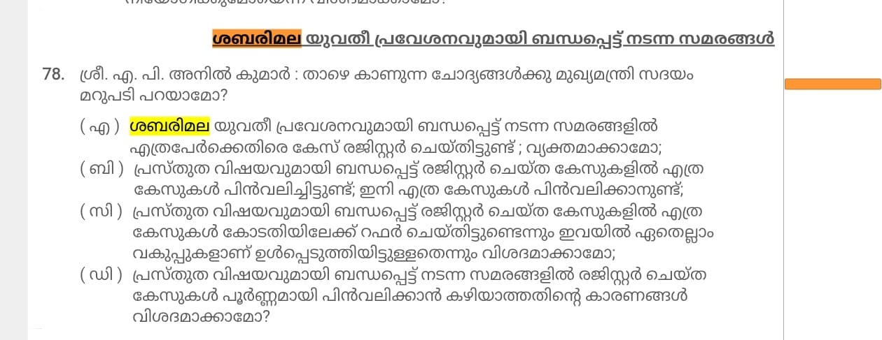 ശബരിമല യുവതീപ്രവേശവുമായി ബന്ധപ്പെട്ട് നടന്ന പ്രതിഷേധങ്ങളില് പങ്കെടുത്തവര്ക്ക് എതിരെയുള്ള കേസുകളില് എന്തു നടപടി എടുത്തു എന്ന നിയമസഭാ ചോദ്യത്തിന് മൂന്ന് മാസമായിട്ടും മറുപടി നല്കാതെ സര്ക്കാര്. സര്ക്കാറിന്റെ ഈ നടപടി ചോദ്യം ചെയ്യുകയാണ് പ്രതിപക്ഷം. ഇക്കാര്യം ഉന്നയിച്ച് കോണ്ഗ്രസ് നിയമസഭാകക്ഷി സ്പീക്കര്ക്ക് കത്ത് നല്കി.