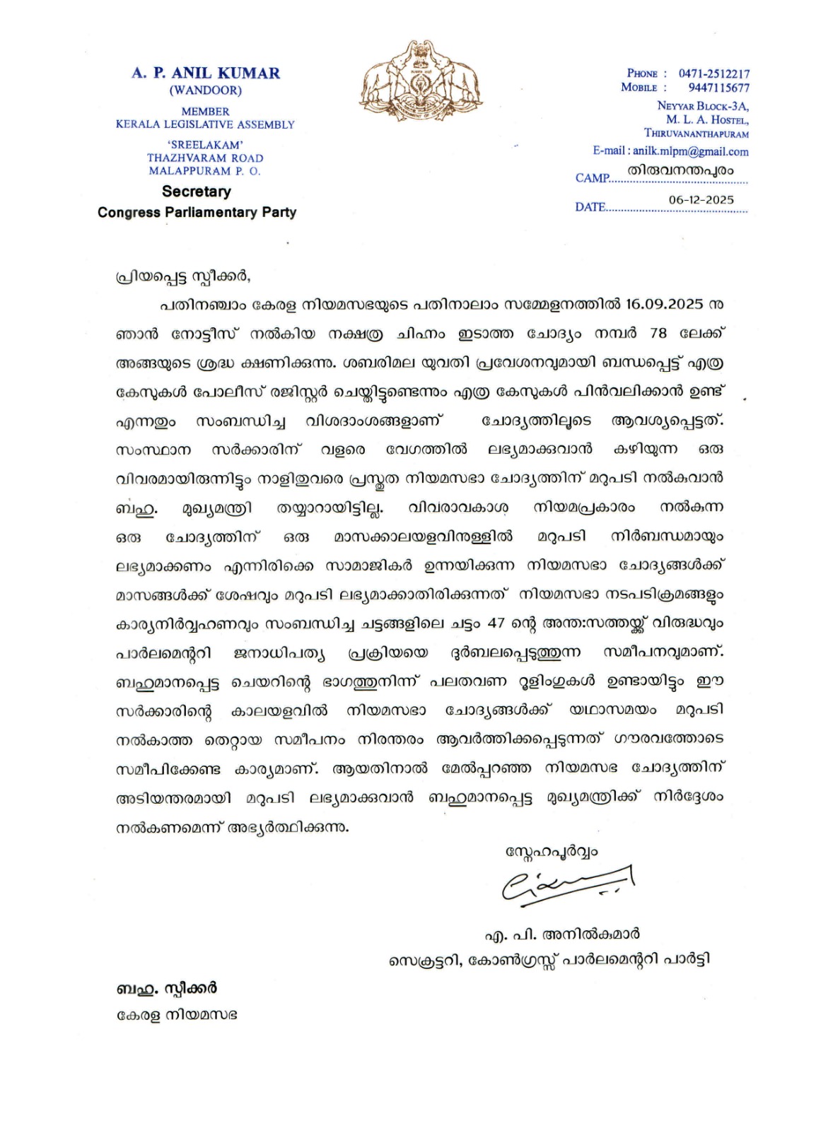 യുവതീപ്രവേശനവുമായി ബന്ധപ്പെട്ട് പോലീസ് എടുത്ത കേസുകളുടെ വിശദാംശങ്ങളാണ് നക്ഷത്ര ചിഹ്നമിടാത്ത ചോദ്യങ്ങളായി എപി അനില്കുമാര് ആവശ്യപ്പെട്ടത്. പഞ്ചായത്ത് തിരഞ്ഞെടുപ്പ് കാലത്ത് ഈ ചോദ്യങ്ങളുടെ ഉത്തരങ്ങള് പുറത്തുവരുന്നത് സര്ക്കാരിനെ വെട്ടിലാക്കുമെന്ന ആശങ്കയിലാണ് മറുപടി നല്കാത്തത് എന്നാണ് കരുതുന്നത്.