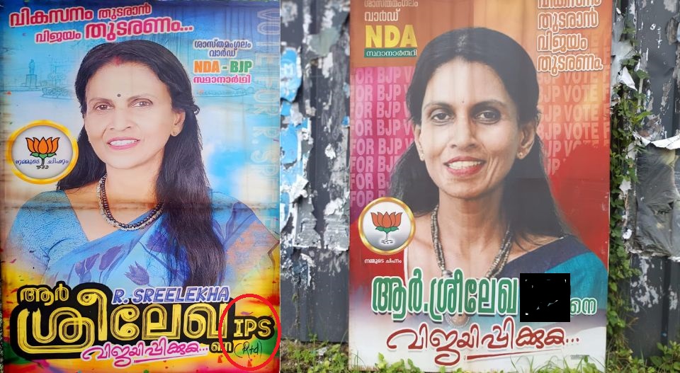 തിരഞ്ഞെടുപ്പ് പ്രചരണത്തിനിടയിൽ ‘ഐപിഎസ്’ ലേബൽ പുലിവാലാകുമെന്ന് മുൻ ഡിജിപി ആർ.ശ്രീലേഖ സ്വപ്നത്തിൽ പോലും വിചാരിച്ചിട്ടുണ്ടാവില്ല. തിരുവനന്തപുരം കോർപ്പറേഷനിലെ ശാസ്തമംഗലം വാർഡിൽ ബിജെപി സ്ഥാനാർത്ഥിയായ ശ്രീലേഖ തിരഞ്ഞെടുപ്പ് പോസ്റ്ററിലും ഫ്ളക്സിലും ചുവരെഴുത്തിലുമൊക്കെ ശ്രീലേഖ ഐപിഎസ് (IPS) എന്ന് ചേർത്തിരുന്നു. ഇതിനെതിരെ ആം ആദ്മി സ്ഥാനാർത്ഥി ടി എസ് രശ്മി നല്കിയ പരാതിയുടെ അടിസ്ഥാനത്തിലാണ് തിരഞ്ഞെടുപ്പു് കമ്മീഷൻ ഐപിഎസ് എന്നത് നീക്കംചെയ്യാൻ ആവശ്യപ്പെട്ടത്. ചില പോസ്റ്ററുകളിൽ കമ്മിഷൻ നേരിട്ടെത്തി ‘ഐപിഎസ്’ മായിച്ചു, തൊട്ടുപിന്നാലെ ബിജെപി പ്രവർത്തകർ കുറച്ച് പോസ്റ്ററിലും ഫ്ളക്സിലും റിട്ട (Rtd) എന്നുകൂടി എഴുതിചേർത്തിട്ടുണ്ട്.