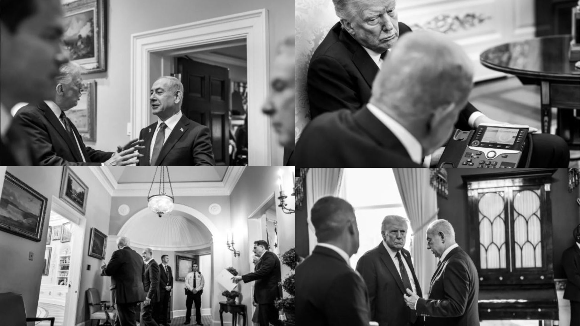 ഡൊണാൾഡ് ട്രംപിൻറെ കയ്യിൽ ഫോൺ, റിസീവർ നെതന്യാഹുവിന്റെ കാതിൽ. കടലാസ് നോക്കി ഖത്തർ ഭരണാധികാരിയോട് മാപ്പ് പറയുന്ന ഇസ്രായേൽ പ്രധാനമന്ത്രി. ഗാസയ്ക്കുള്ള യുഎസ് സമാധാന പദ്ധതി പ്രഖ്യാപിച്ചുകൊണ്ട് അമേരിക്കൻ പ്രസിഡന്റ് ഡൊണാൾഡ് ട്രംപും ഇസ്രായേൽ പ്രധാനമന്ത്രി ബെഞ്ചമിൻ നെതന്യാഹുവും തമ്മിലുള്ള കൂടികാഴ്ചക്കിടെയുള്ള ബ്ലാക് ആൻഡ് വൈറ്റ് ചിത്രങ്ങൾ സോഷ്യൽ മീഡിയയിൽ ചർച്ചയാകുന്നു. വൈറ്റ്ഹൗസ് തന്നെയാണ് ചിത്രങ്ങൾ പുറത്തുവിട്ടത്.