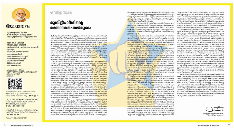 “മുസ്ലിംലീഗിന്റെ മതേതര പൊയ്മുഖം” എന്ന പേരിലുള്ള മുഖപ്രസംഗത്തിലാണ് ഈ വിമർശനം. മലബാർ കലാപം നടന്ന മണ്ണിൽ നിന്ന് ഉയർന്നു വന്ന പാർട്ടിയാണ് ലീഗ് എന്ന കാര്യം ഭൂരിപക്ഷ സമൂഹം മറന്നുപോയത് അവർ ചെയ്ത തെറ്റാണെന്ന് വെള്ളാപ്പള്ളി നടേശൻ പറയുന്നു. മുസ്ലിം വോട്ട് ബാങ്കിന്റെ മൊത്തക്കച്ചവടം പേടിച്ചാണ് മുന്നണി രാഷ്ട്രീയം ലീഗിനെയും കെ എം ഷാജിയെപ്പോലുള്ള നേതാക്കളെയും ചുമക്കുന്നതെന്നും മുഖപ്രസംഗത്തിൽ വിമർശിക്കുന്നു.