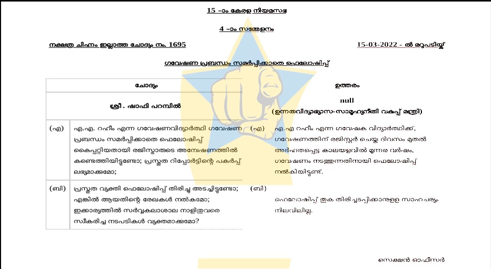 ഈ വിഷയത്തിൽ 2022 മാർച്ച് 15ന് ഷാഫി പറമ്പിൽ ഉന്നത വിദ്യാഭ്യാസമന്ത്രിയോടായി നിയമസഭയിൽ ഉന്നയിച്ച ചോദ്യങ്ങളും മന്ത്രി ആർ ബിന്ദു നല്കിയ മറുപടിയുമാണ് വീണ്ടും പ്രചരിക്കുന്നത്. “എഎ റഹിം എന്ന ഗവേഷണ വിദ്യാർത്ഥി ഗവേഷണ റിപ്പോർട്ട് സമർപ്പിക്കാതെ ഫെലോഷിപ്പ് കൈപ്പറ്റിയതായി രജിസ്ട്രാറുടെ അന്വേഷണത്തിൽ കണ്ടെത്തിയിട്ടുണ്ടോ? പ്രസ്തുത റിപ്പോർട്ടിൻ്റെ പകർപ്പ് ലഭ്യമാക്കാമോ ? പ്രസ്തുത വ്യക്തി ഫെലോഷിപ്പ് തിരിച്ചടച്ചിട്ടുണ്ടോ? എങ്കിൽ ആയതിൻ്റെ രേഖകൾ നൽകാമോ? ഇക്കാര്യത്തിൽ സർവകലാശാല നാളിതുവരെ സ്വീകരിച്ച നടപടികൾ വ്യക്തമാക്കാമോ” എന്നിങ്ങനെ ചോദ്യങ്ങളാണ് ഷാഫി ഉന്നയിച്ചത്.